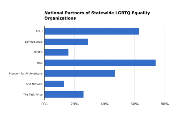 Equality Federation members clearly understand the importance of developing strategic partnerships to achieve priorities. The results of this year’s State of the States survey show that 90% of our groups work with national LGBTQ organizations. The percentage of members who work with specific nationals can be seen below.