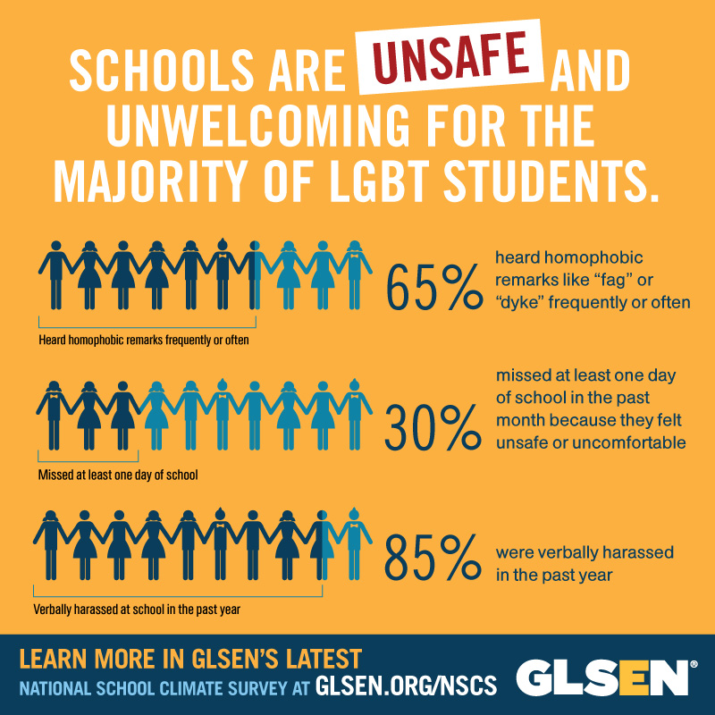 This latest edition of GLSEN’s National School Climate Survey, which was taken by thousands of students nationwide, revealed some major findings about LGBT student treatment in schools, and the lack of policies to protect them: