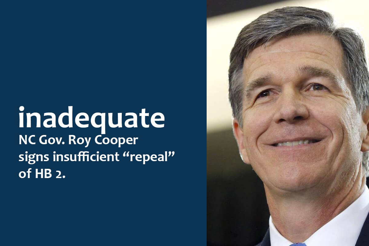 Equality Federation condemned North Carolina Governor Roy Cooper for signing HB 142, a law that legislators attempted to frame as a repeal of the famously discriminatory HB 2. In fact, the new law keeps in place the most troubling parts of HB 2, including the provision that prevents local governments from passing nondiscrimination ordinances.