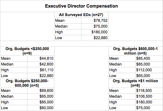 Right now, 30 groups have executive director positions—68% of our 44 member organizations. The other 14 organizations operate with working volunteer boards.