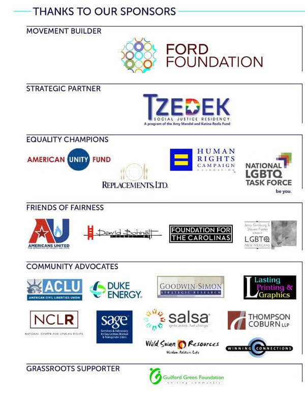 Summer Meeting is only possible with your support and our corporate sponsors. This year, we had more support from businesses than ever before, thanks in large part to the efforts of Ian Palmquist, Director of Leadership Programs, and the Equality North Carolina team. Thank you to Ford Foundation, the Amy Mandel and Katina Rodis Fund, American Unity Fund, Replacements, LTD., Human Rights Campaign, National LGBTQ Task Force, Americans United, David Bohnett Foundation, Foundation For The Carolinas, Jerry Ginsburg & Steven Foster, ACLU, Duke Energy, Goodwin Simon Strategic Research, Lasting Printing & Graphics, NCLR, SAGE, SALSA, Thompson Coburn, LLP., Wild Swan Resources, Winning Connections, and Guilford Green Foundation.